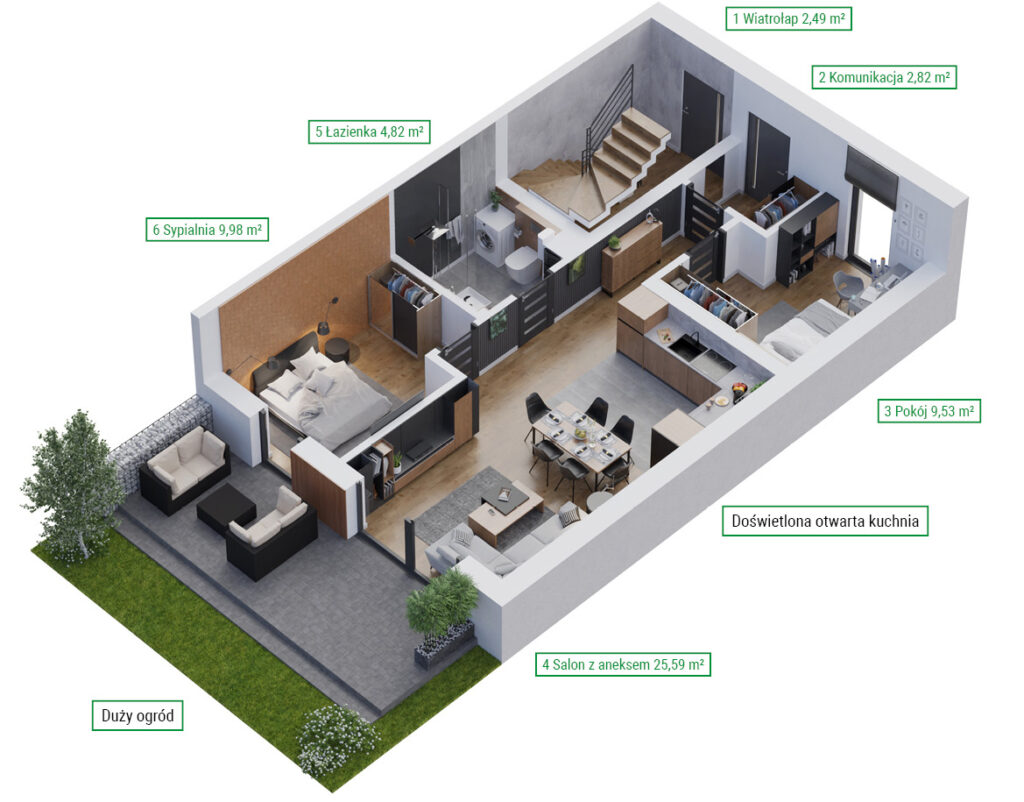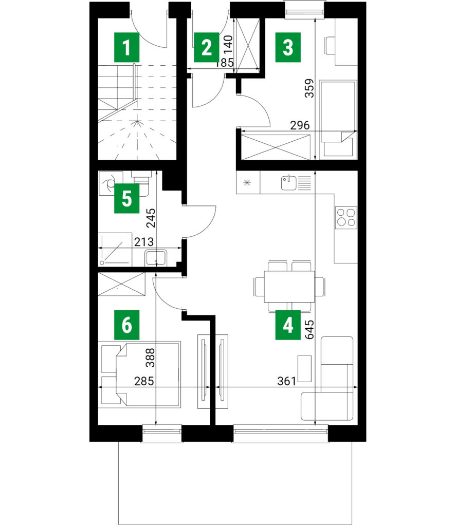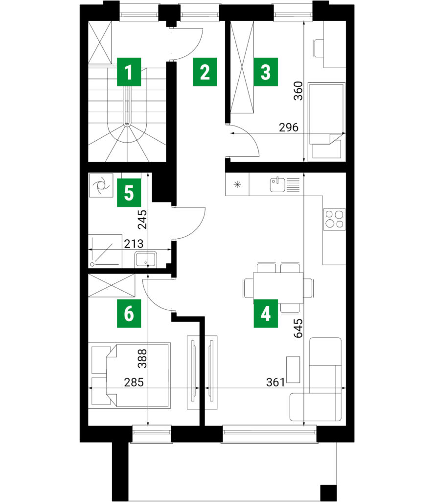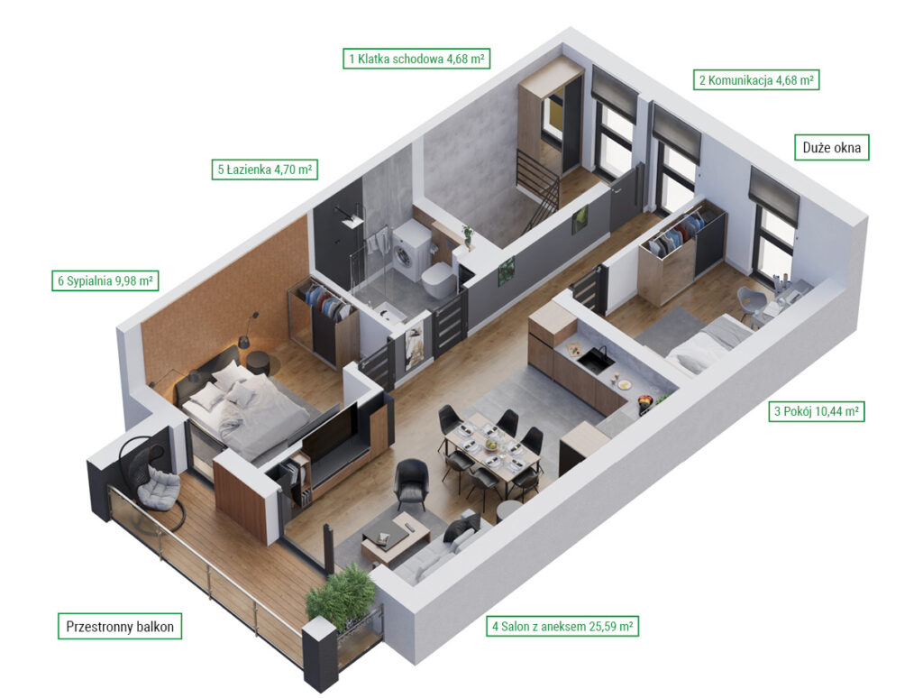 Mieszkania na parterze mają powierzchnię 55 m² i duże tarasy, natomiast lokale na piętrach to powierzchnia 60 m² i balkony. Wszystkie mieszkania wyróżnia bardzo komfortowy w codziennym użytkowaniu układ pomieszczeń, który składa się z przestronnego salonu z aneksem kuchennym, dwóch sypialni oraz łazienki. Dzięki dużym oknom wnętrza są pełne promieni słońca. zwiń ∧