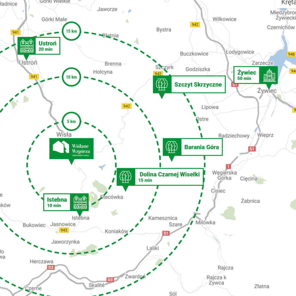 Lokalizacja sprzyja zarówno osobom, które lubią aktywny wypoczynek, jak i tym, które cenią sobie ciszę i spokój. W pobliżu liczne trasy turystyczne piesze, rowerowe i narciarskie. Niedaleko m.in. do: Przełęczy Kubalonka, Zapory Wisła Czarne (Jeziora Czerniańskiego), Rezydencji Prezydenta RP, Baraniej Góry czy Doliny Czarnej Wisełki. Warto również wspomnieć o tym, że dojazd do Rynku w Wiśle zajmuje tylko ok. 10 min, więc wszystkie niezbędne na co dzień lokalizacje, takie jak sklepy, przedszkola czy punkty usługowe, są pod ręką.